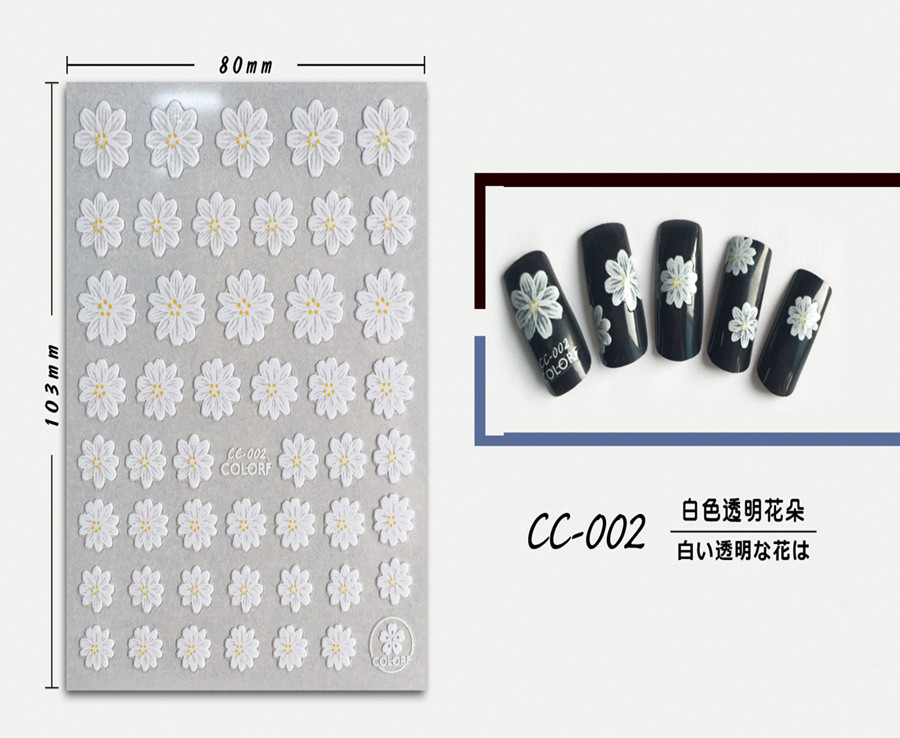You are here: Home » Products » Nail Sticker » 3D Nail Sticker » CC Series Nail Sticker » CC-002 3D White Transparent Flower Nail Sticker