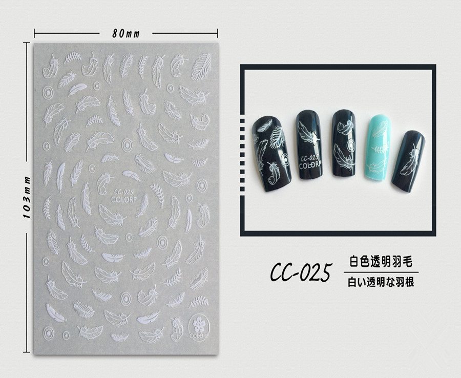 You are here: Home » Products » Nail Sticker » 3D Nail Sticker » CC Series Nail Sticker » CC-025 3D White Transparent Feather Nail Sticker