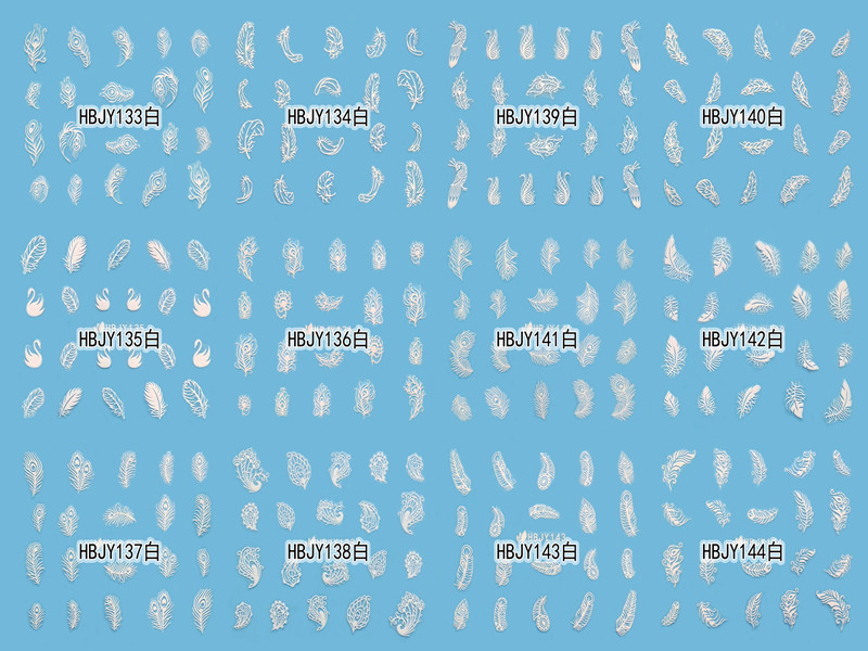 You are here: Home » Products » Nail Sticker » 3D Nail Sticker » HBJY Series Nail Sticker » HBJY133-144 3D White Feather Nail Art Sticker