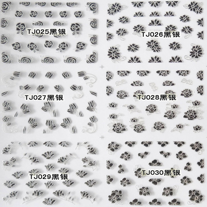 You are here: Home » Products » Nail Sticker » 3D Gold Silver Nail Sticker » TJ Series Nail Sticker » TJ025-036 3D Black Silver Flower Nail Art Sticker