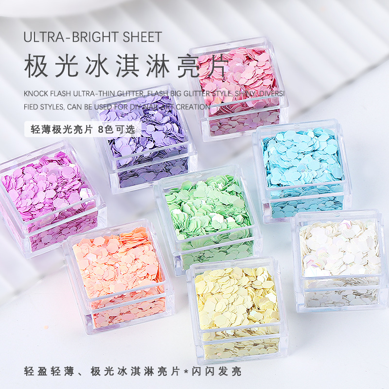 You are here: Home » NEW PRODUCTS » 2025 New Arrival » March,2025,New Arrival » Ultra-Bright Sheet Nail Sequins Laser Aurora Ice Cream Glitter Hexagon Shape Nail Accessories